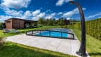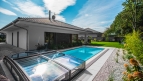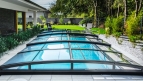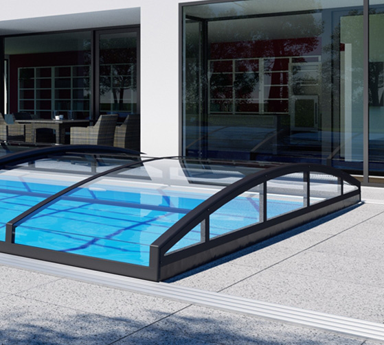 The CASABLANCA INFINITY is discreet and refined at the same time. A low pool enclosure, which appears inconspicuous at first glance in the garden. A curved transparent enclosure, a futuristic carbon look and the low Air track are proof of this.