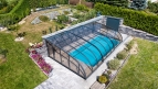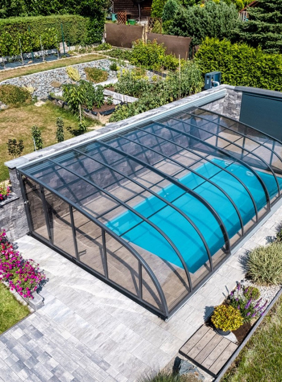 What's the best way to cover a pool that's located close to your house wall? The solution is a custom-made DALLAS on the wall, which offers you an unexpected amount of space on a small surface.