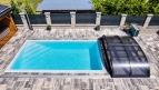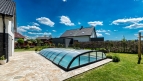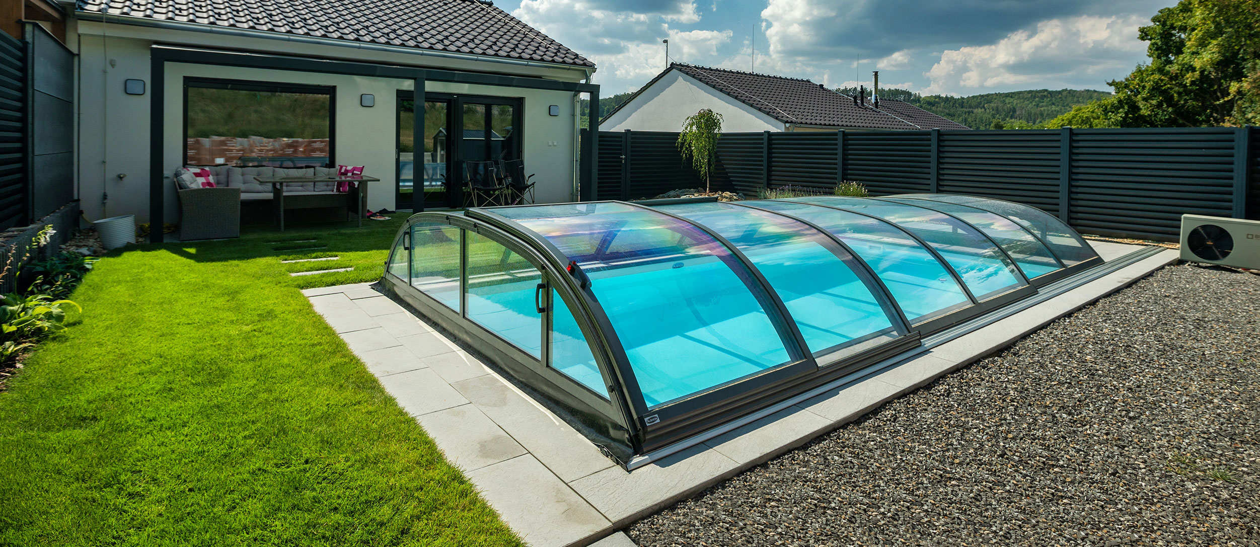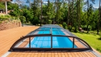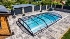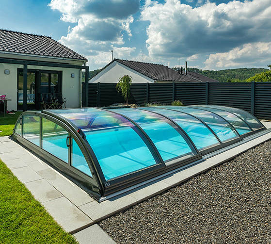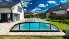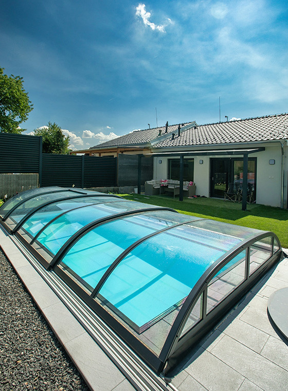 The DALLAS pool enclosure has round shapes and graceful curves. You can choose the medium height DALLAS / DALLAS CLEAR pool enclosure.